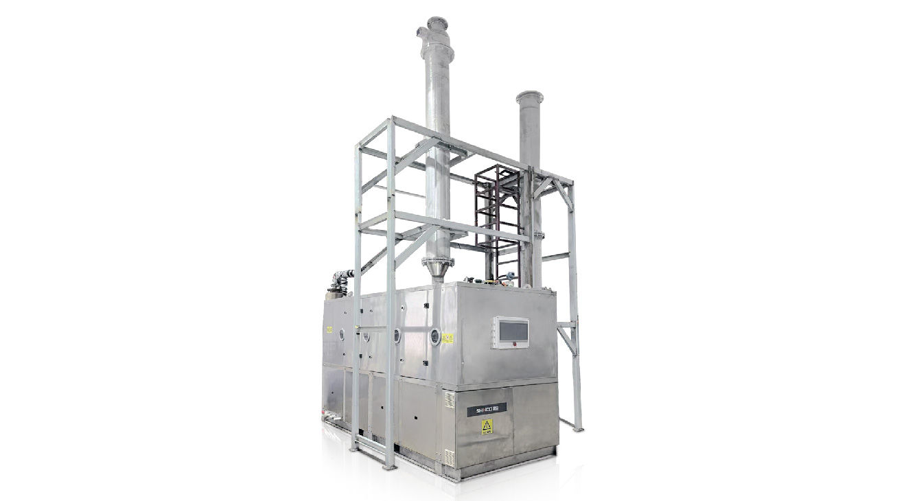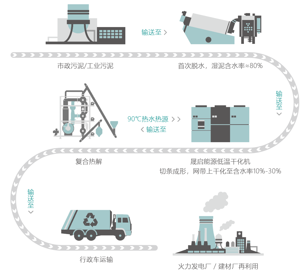 晟啟廢液處理處置工藝,由液體經過濃縮機濃縮(可選)處理,再經過PMVR干燥機(可選)把對濃縮液的蒸發、干燥,把濃縮液變為再生水或達到標準的直接排放水及干燥物料,干燥后的物料再接駁復合熱解機進行深度減量處理,最終得到可燃成份的熱解氣體及炭土,復合熱解流程再對熱量進行深度回收,將冷卻水水溫加熱至90℃以上,可以作為前端濃縮或干燥物料的熱源,最終產物進行無害化處理或資源化利用。